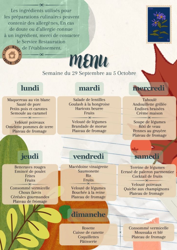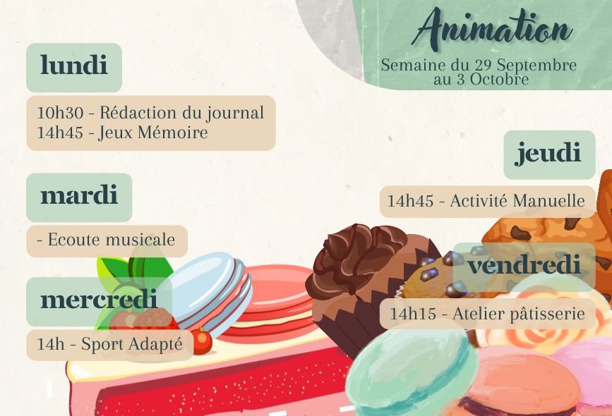 Vous trouverez les repas des résidents et le planning des animations de la semaine.