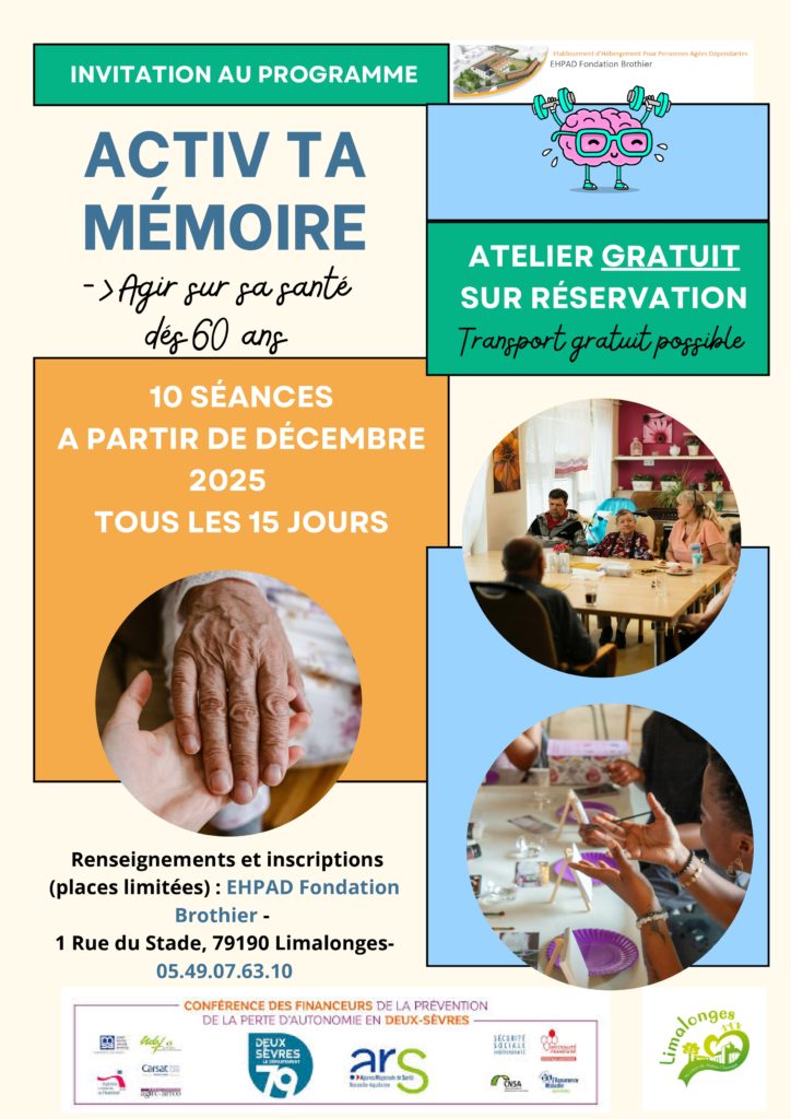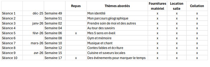 2 séance de 1h30 par mois soit 3h d’Atelier Cognitifs par mois sont prévues pour l’établissement à partir du mois de décembre 2025, soit un total de 15h d’AC sur l’ensemble du Projet. Le transport pour les personnes âgées de 60 ans et plus vivant à domicile est proposé gratuitement pour avant et après chaque séance (sur inscription préalable).
