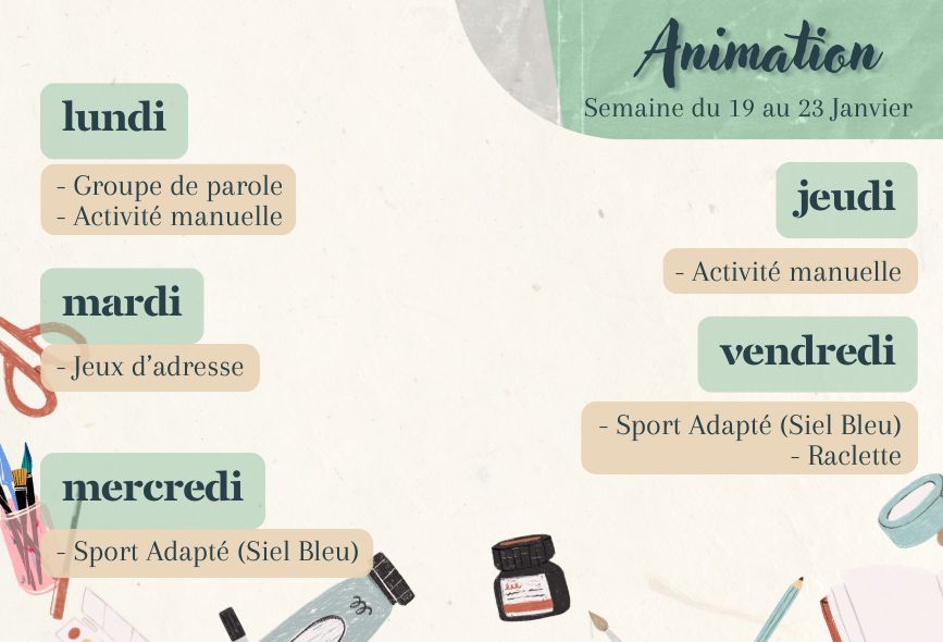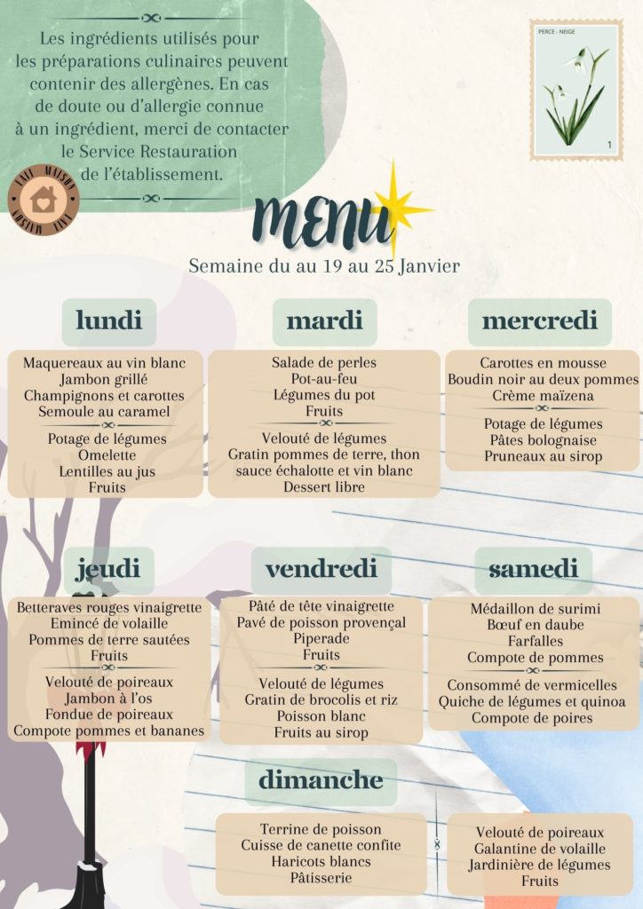 Vous trouverez les repas des résidents et le planning des animations de la semaine.