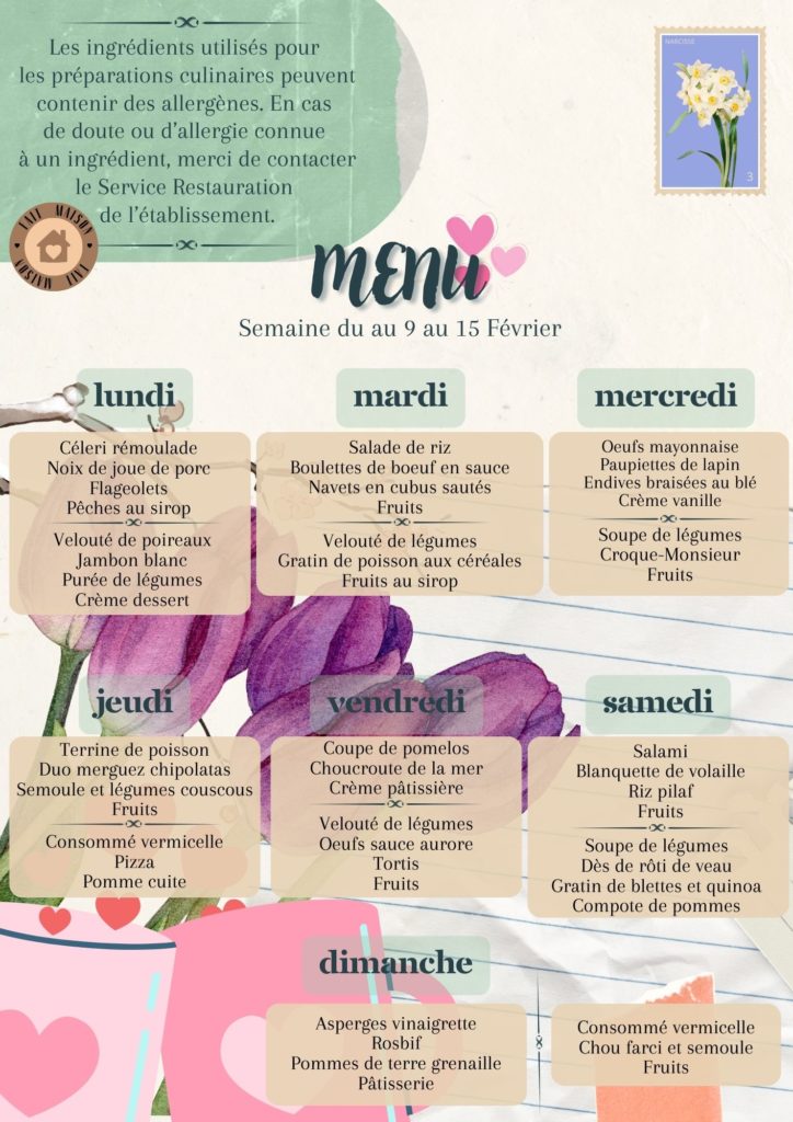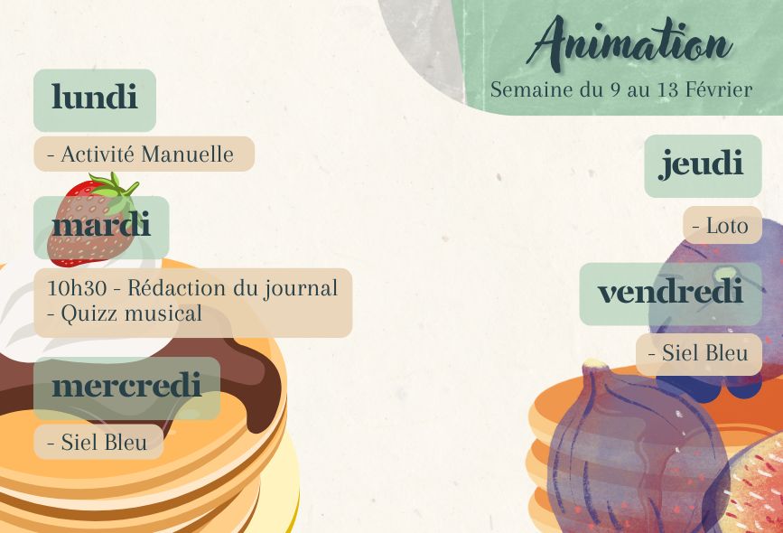 Vous trouverez les repas des résidents et le planning des animations de la semaine.