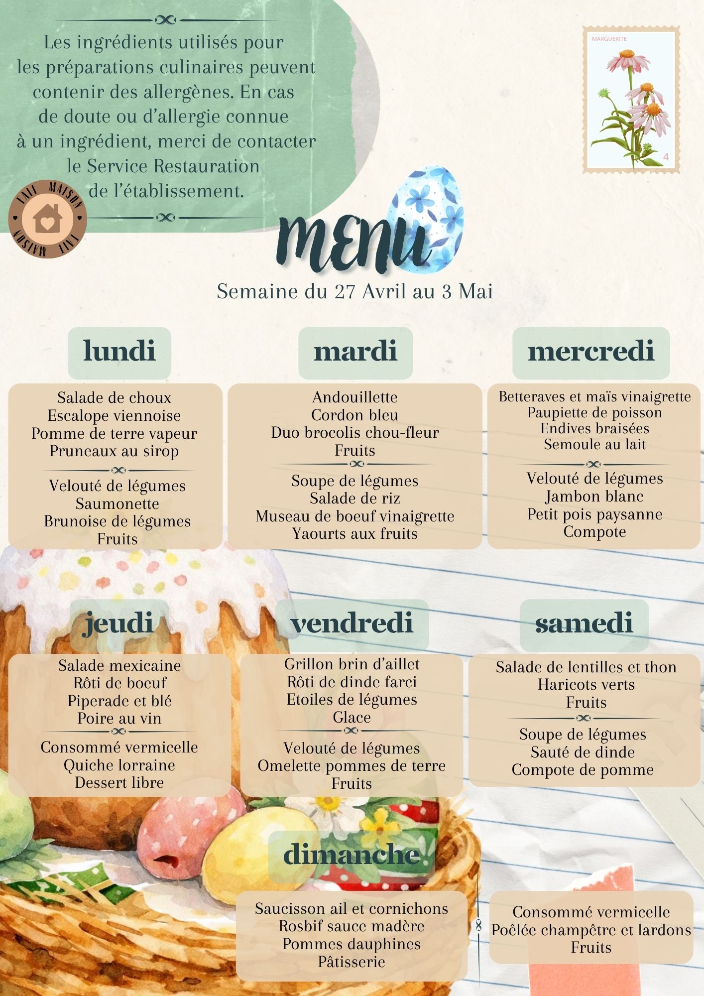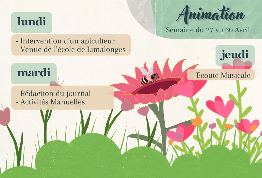 Vous trouverez les repas des résidents et le planning des animations de la semaine.